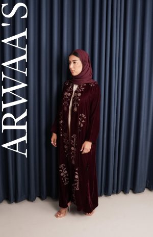 عباية مخمل مطرزة بطابع فلسطيني بلون الأحمر الغامق